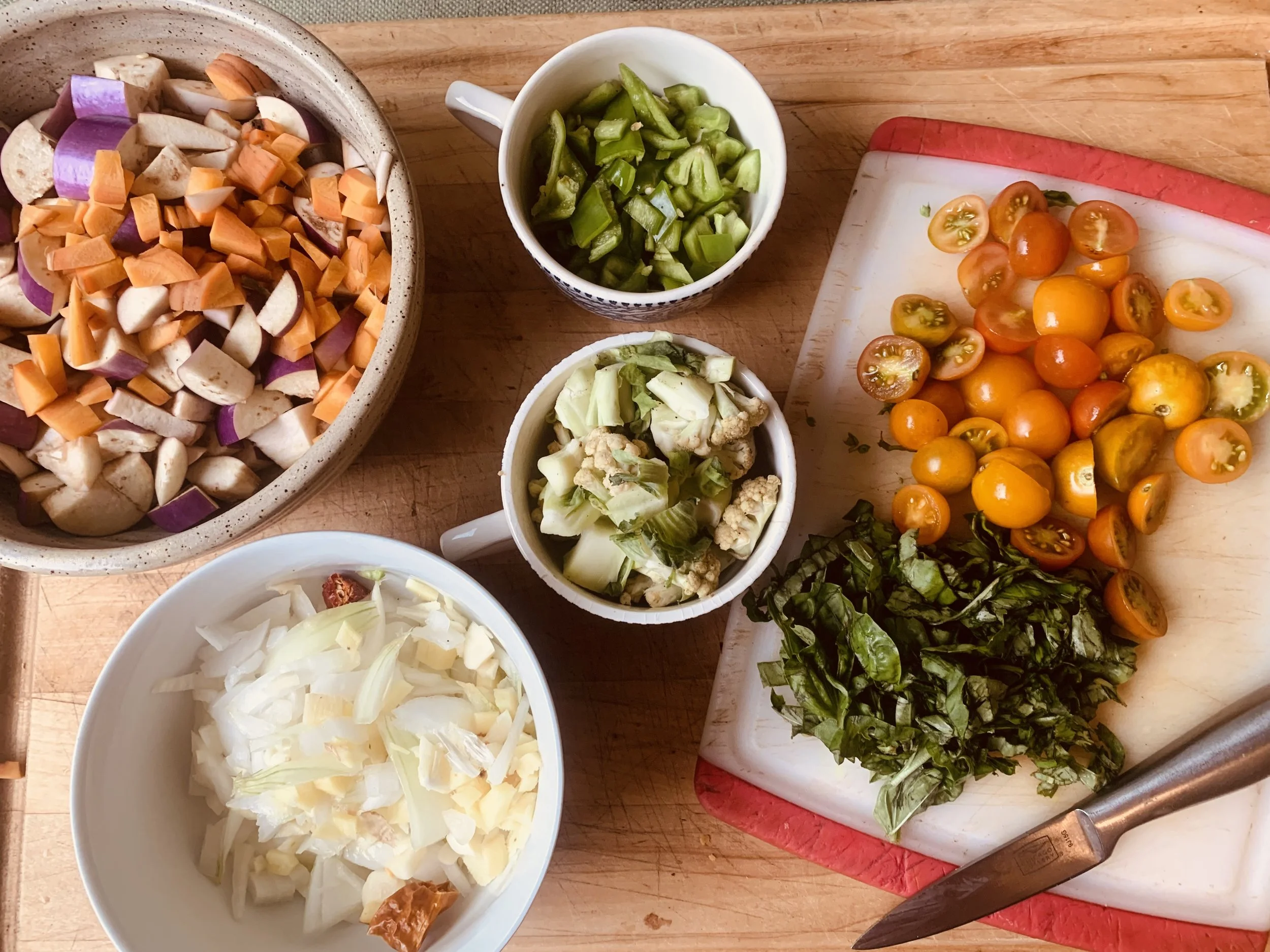 This summer curry is equally good prepared in advance, but I love going out and picking the ingredients from the garden and working with them right away. To be super healthy, serve over brown rice or with whole wheat pita bread. Although this version is vegan, you can add additional protein, such as tofu, chicken, or bits of leftover pork or beef. It can easily be doubled. Don’t be scared by the long list of ingredients, it is really easy to make.